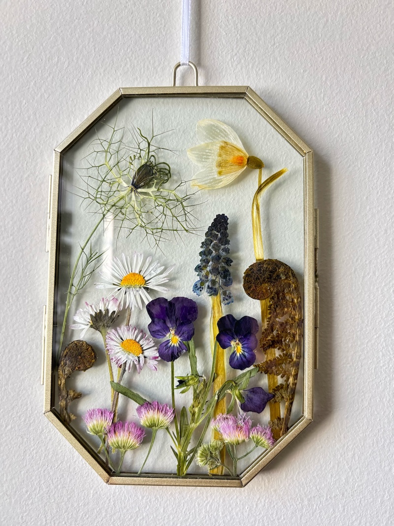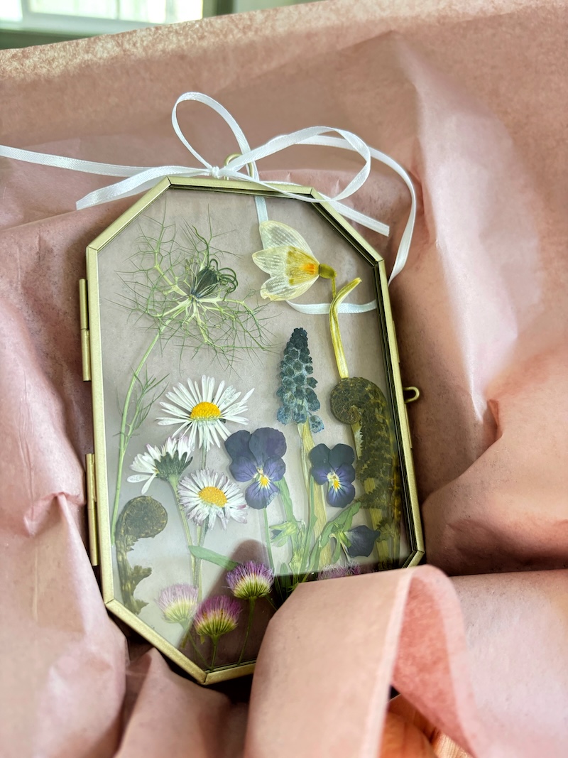 One of the greatest delights of spring is finding the first of each kind of flower blooming! Starting with snowdrops and muscari, then we find viola and fiddleheads, followed by English daisies and nigella… Each flower brings fresh joy and hope. Enjoy the awakening of spring, carefully preserved in this 4×6″ glass frame.