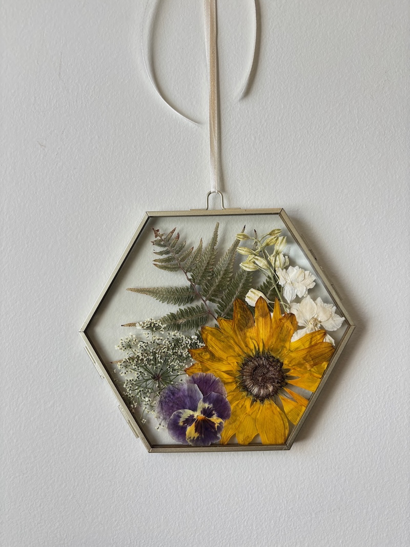 As with all pressed flowers, this piece will retain its color best if hung away from direct sunlight. Over time, flower colors will naturally mellow.