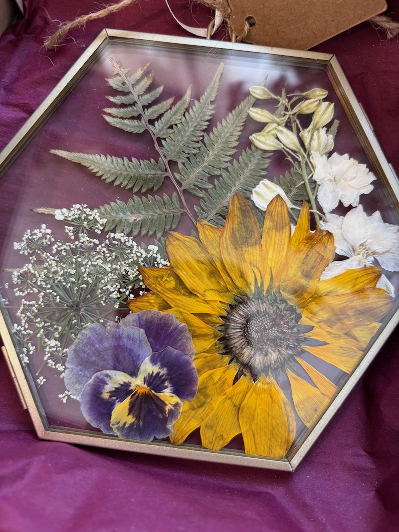 A painted Japanese fern is the backdrop for these beautiful summer flowers, including a miniature sunflower, white Larkspur, Queen Anne’s Lace, and viola, all carefully preserved in this 5×5″ glass frame.